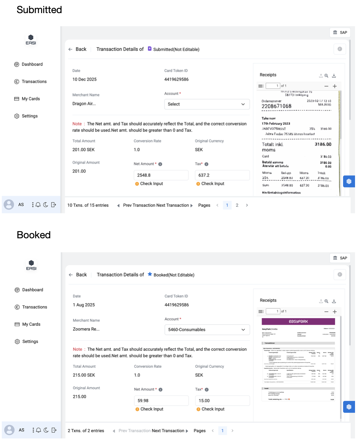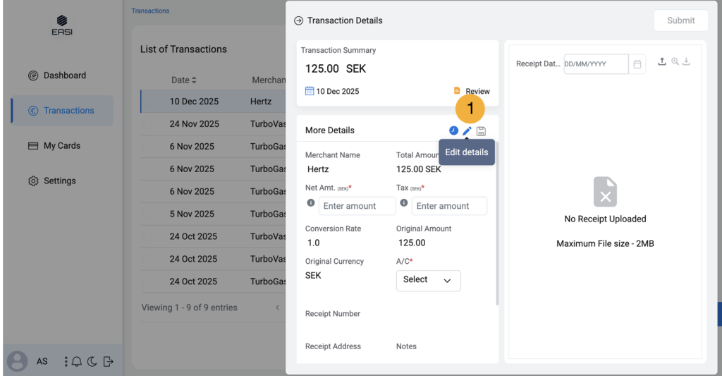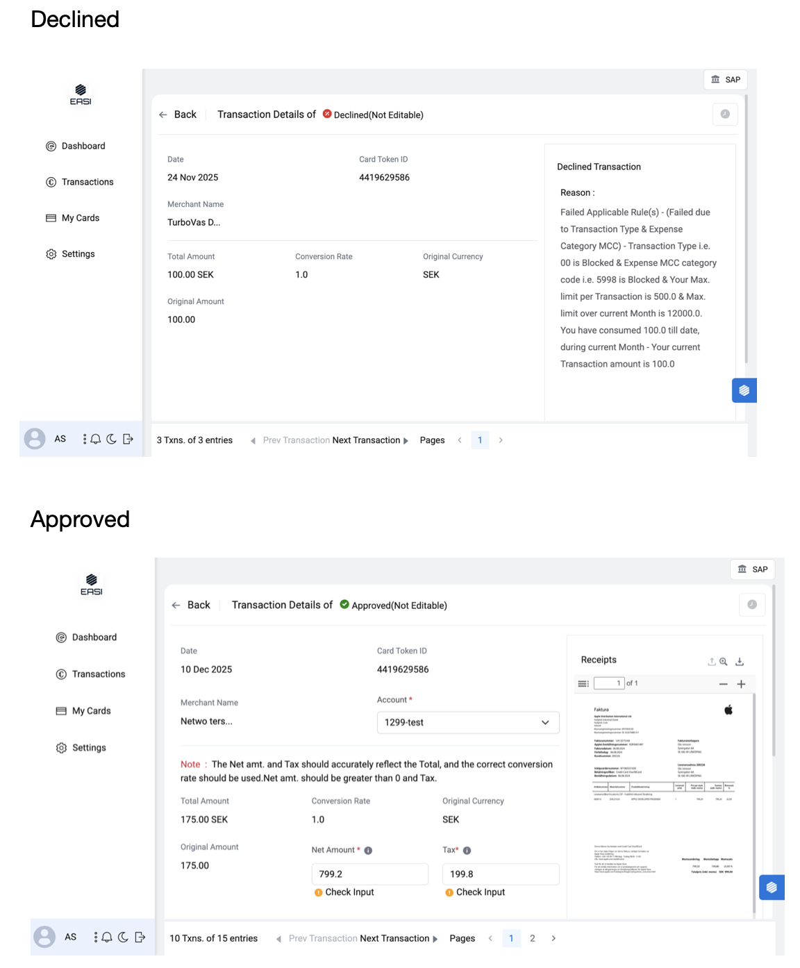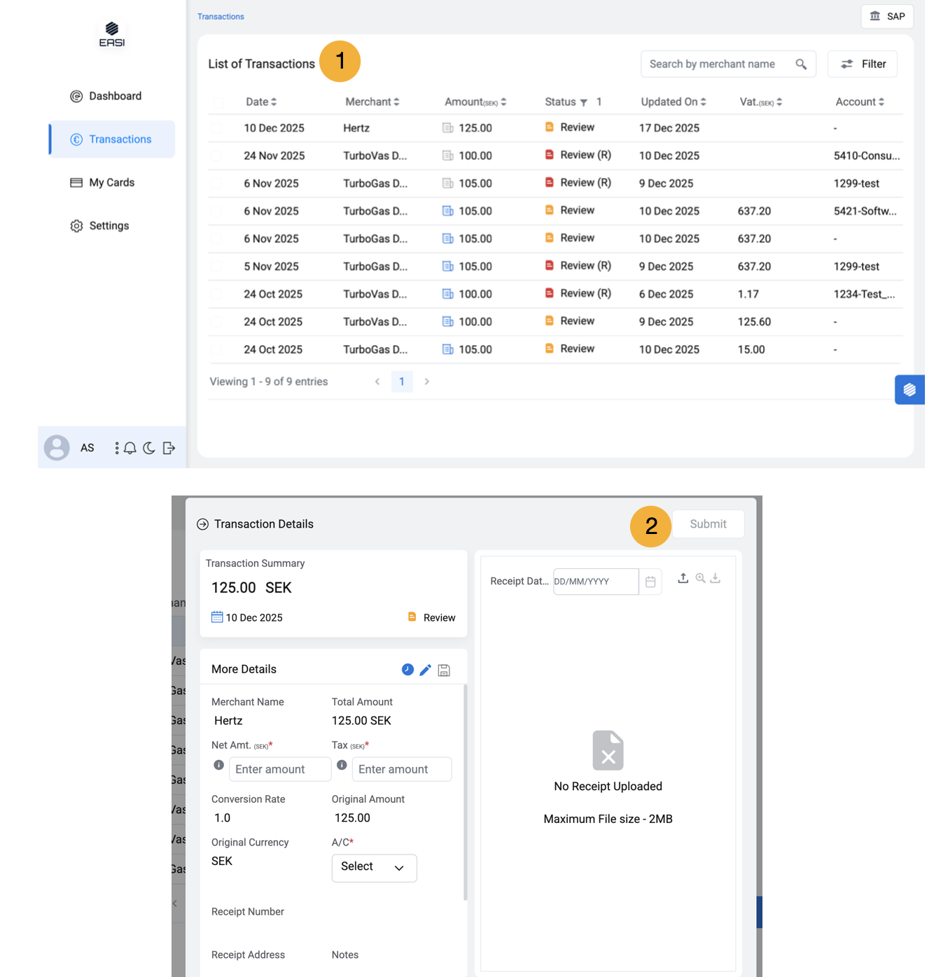 A cardholder can submit / save transactions details which will be reviewed by the admin.