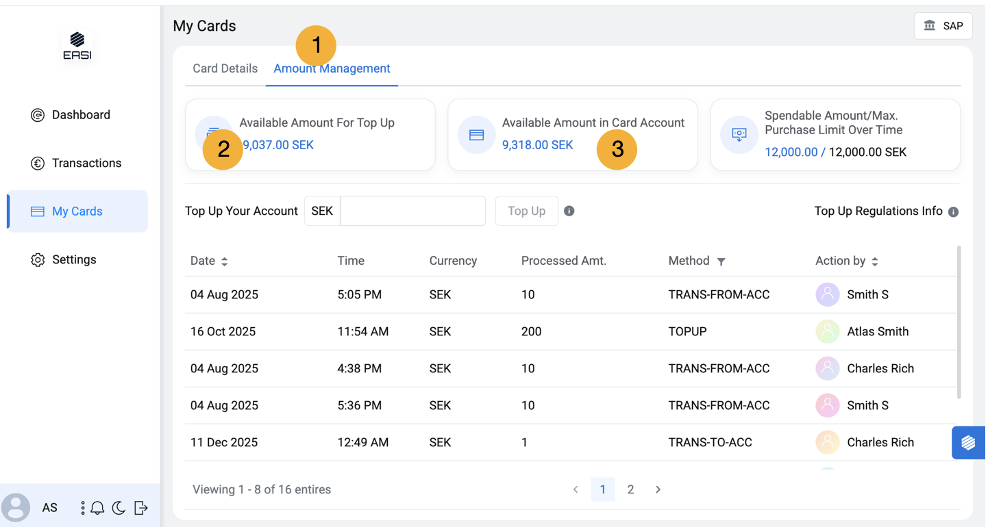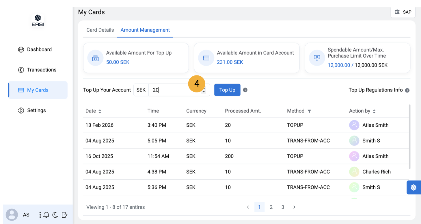 - Amount management tab allows you to view key parameters related to topping up on the top right corner. The table also outlines the top up history with key details of the top up The top up amount is dependent on various parameters like : Available amount for top up Available amount in card account Spendable amount/Max. Purchase limit over time