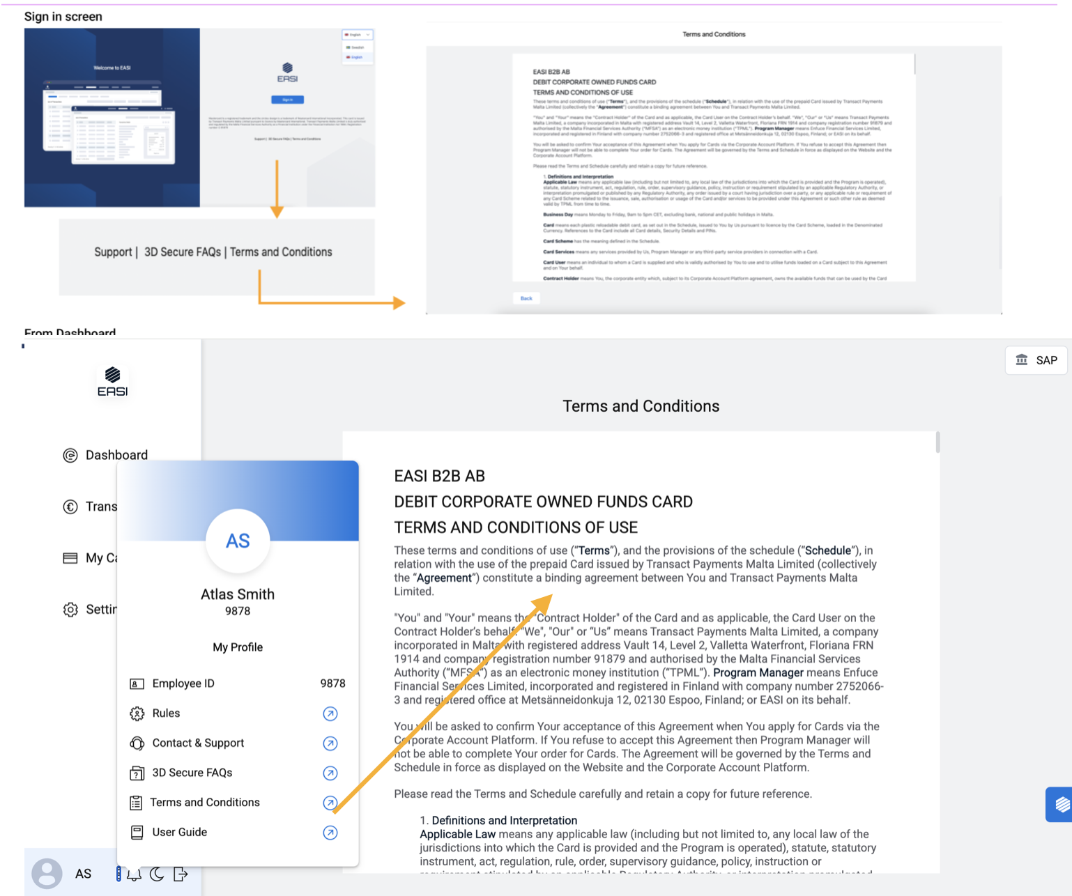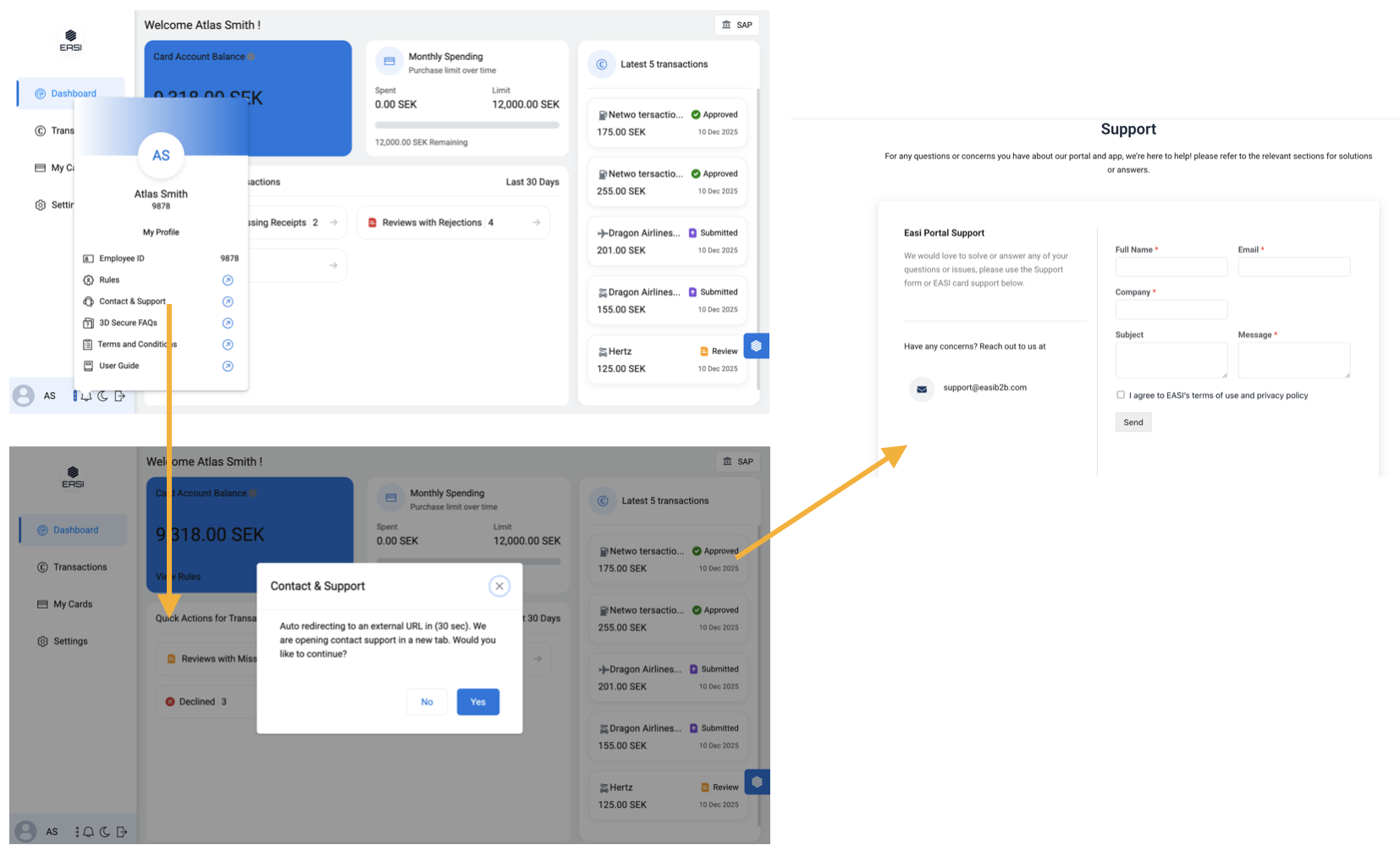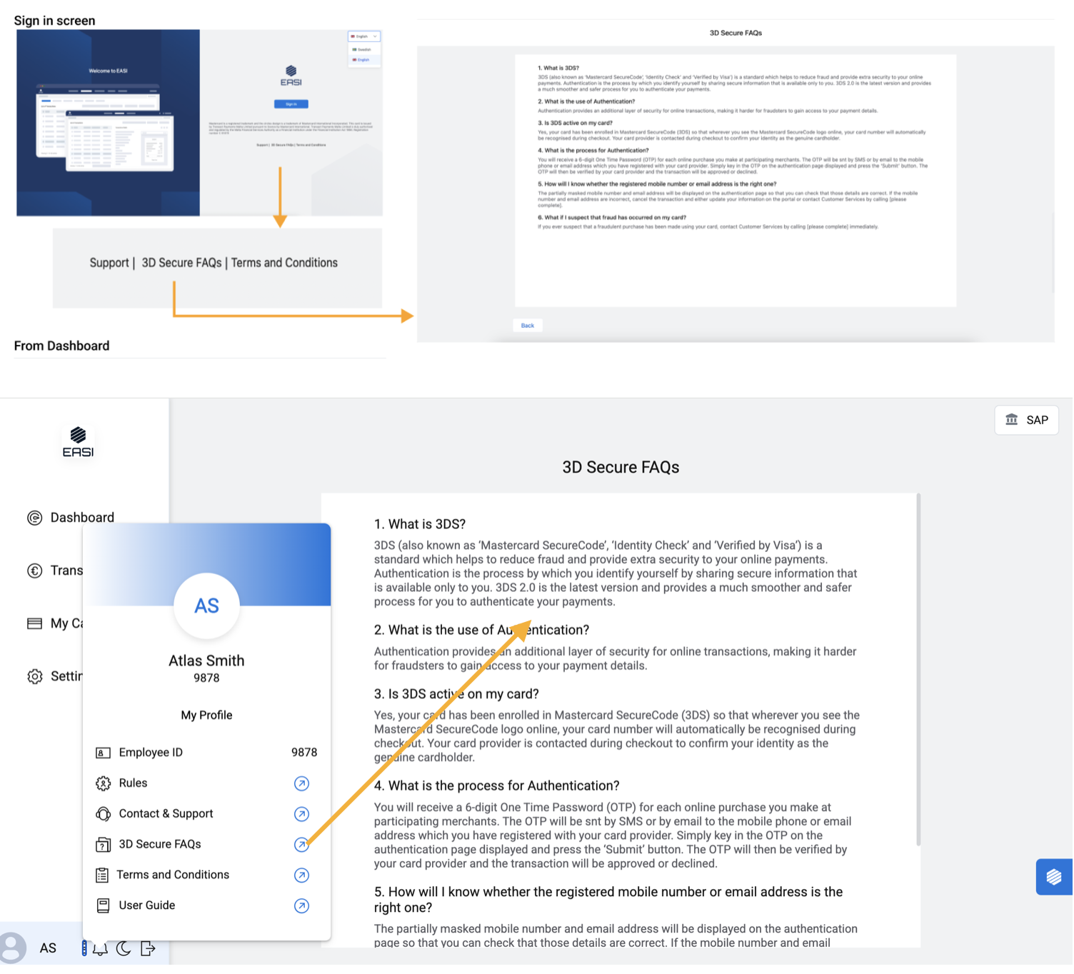 To access Support and 3D Secure FAQs pages, cardholders can click on the given links and it will redirect them to the relevant page in EASI website.
