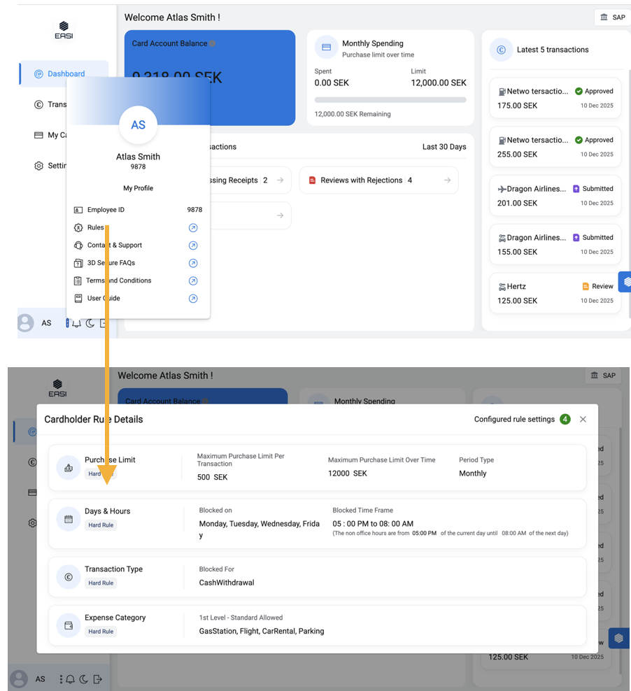 The cardholder can view all the rules governing their expenses on this page. This helps them understand the permissible and non-permissible scenarios, enabling them to make well-managed transactions.