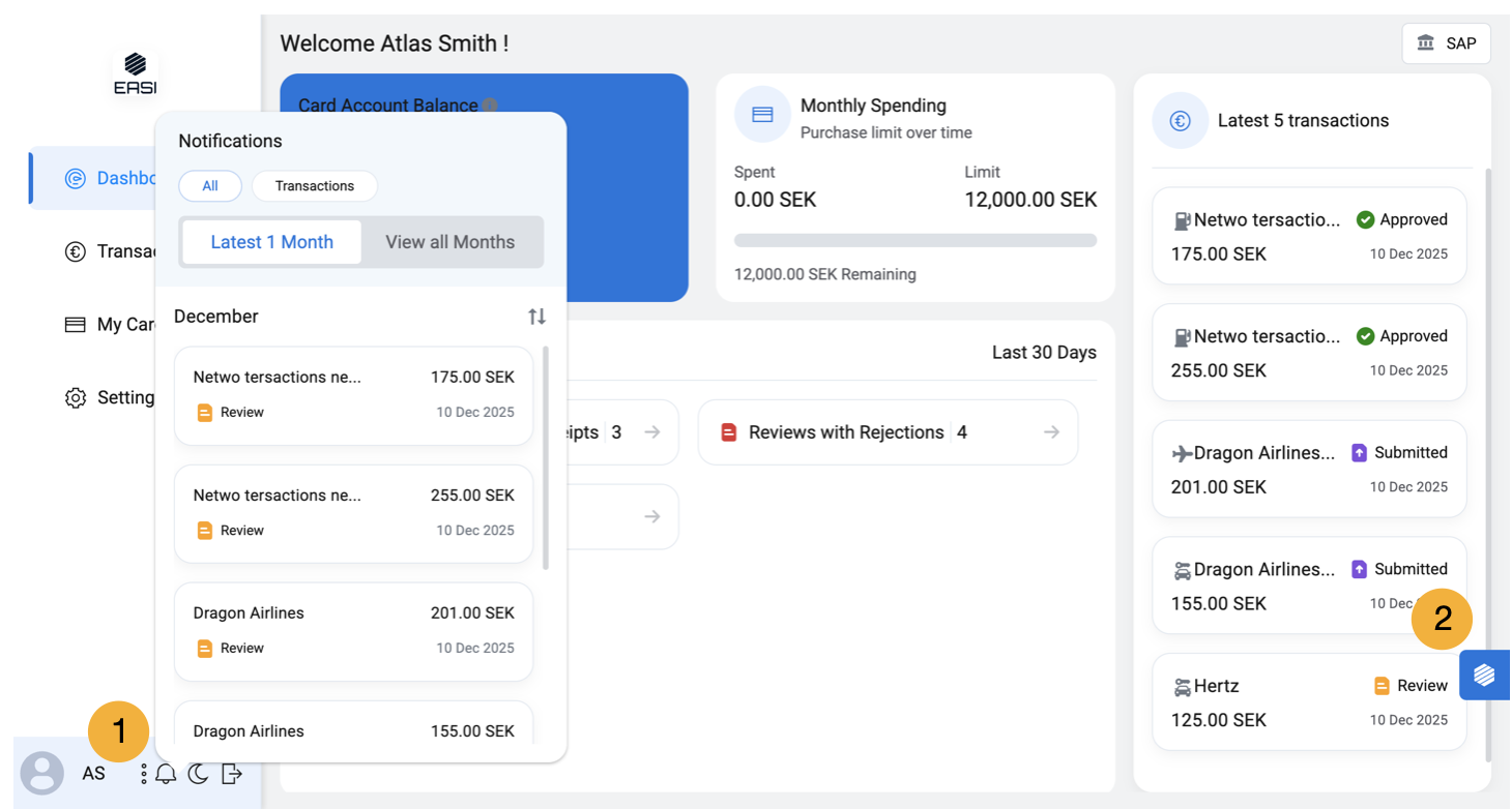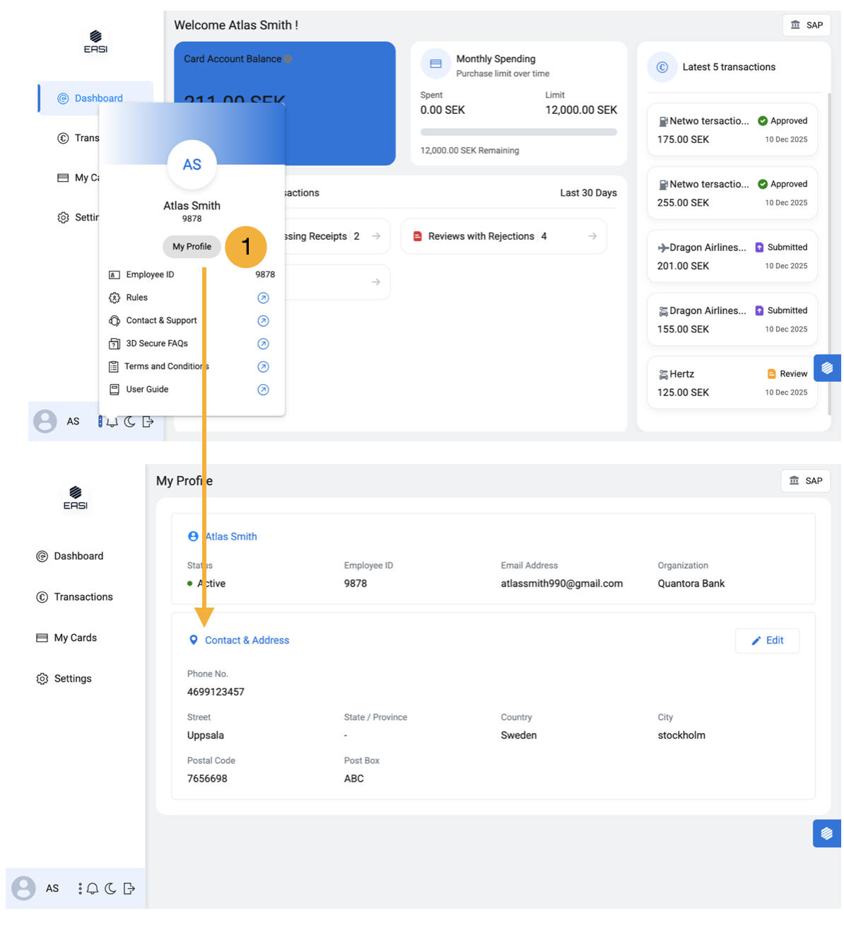 1.The Cardholder Profile section provides a comprehensive overview of the cardholder’s details, including their organization, card information, and expense card rules. It can be accessed from the menu which appears upon clicking the profile icon.