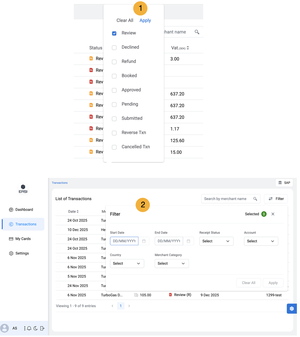 i.Open the “Transactions” module to view the list of transactions. By default, only transactions with a “Review” status are displayed. Use the status filter to display transactions with other statuses if needed.