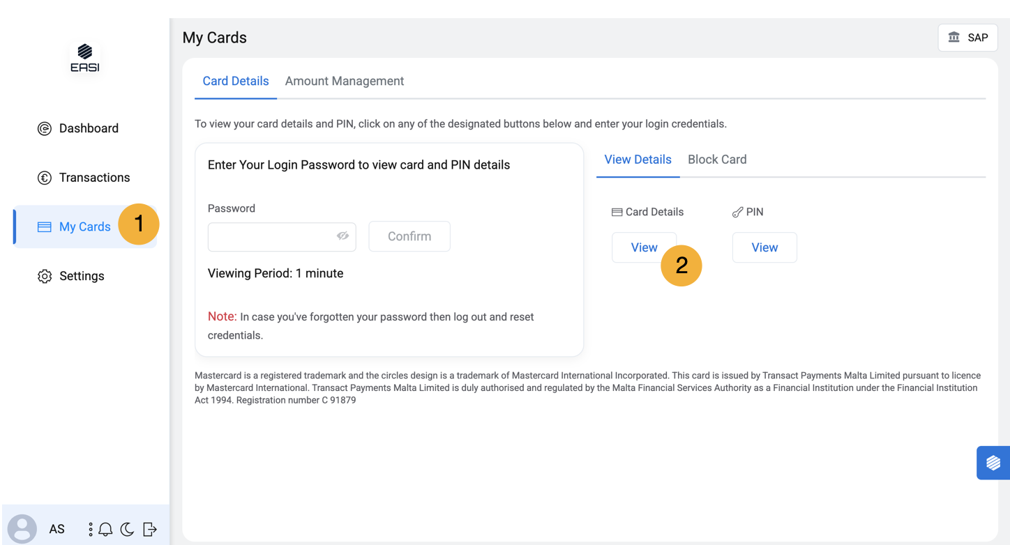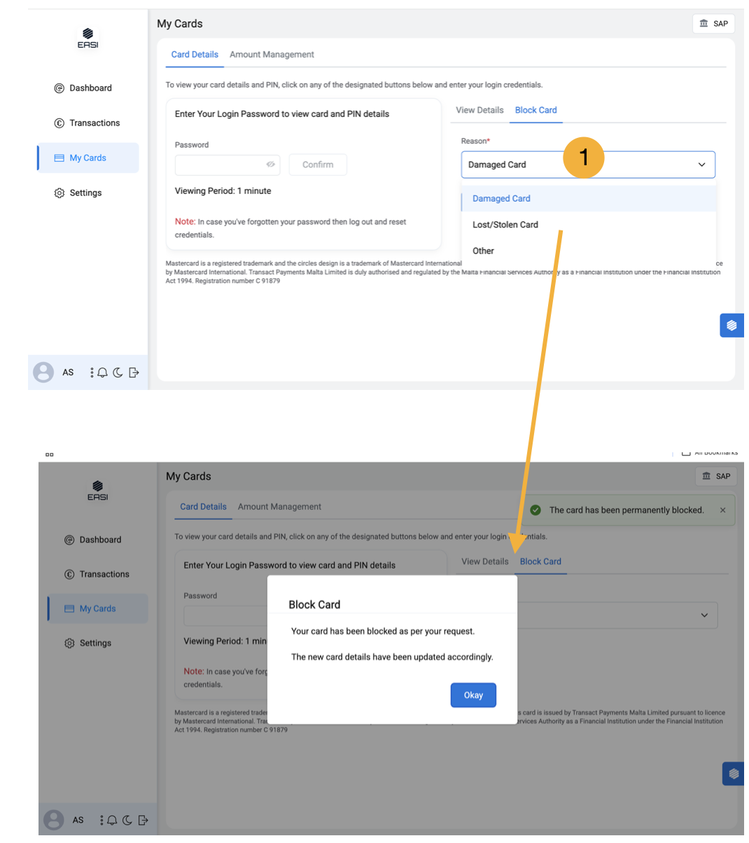 Cardholders can access this page from the “My Cards” module from the left navigation bar, they can view card details and PIN, and have the option to block the card if necessary.