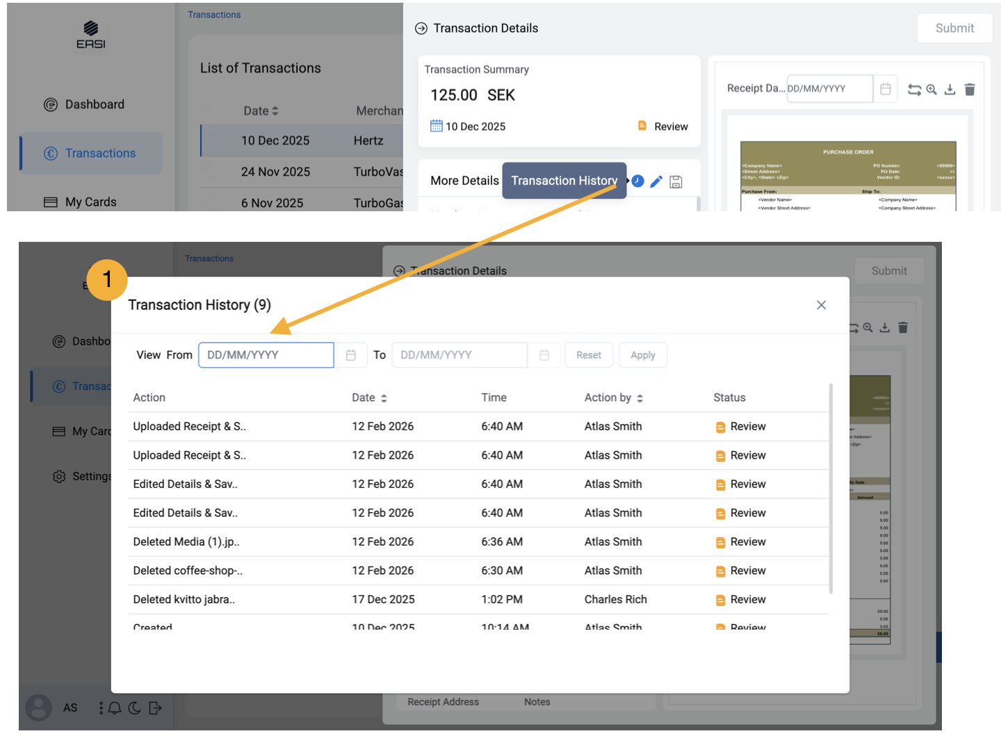 - Transaction history is to view all actions and outcomes related to specific transactions, including the performer of each task