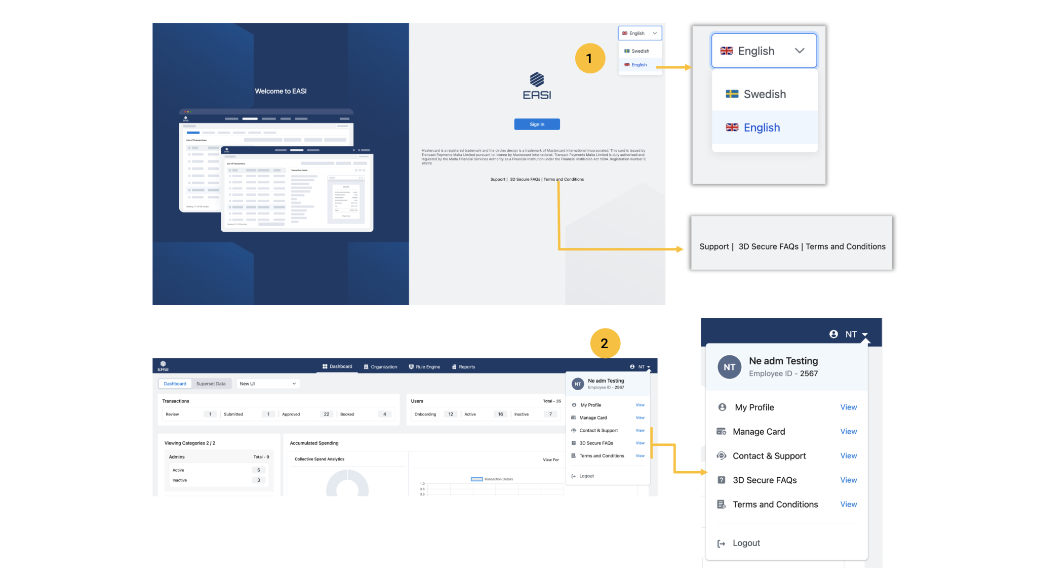 Admins can view their personal information, active roles, and address details under the Profile section. If they are a cardholder, they can also access and view details in the Manage Card and Card Details pages related to their account.