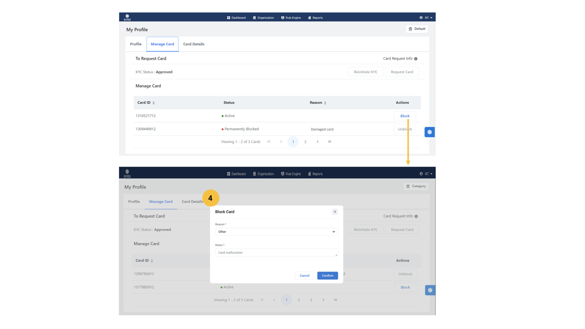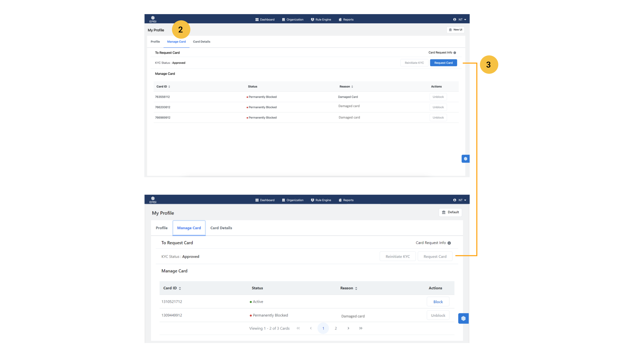 This segment provides information such as KYC status, active and blocked cards, with features for reinitiating KYC and requesting cards.