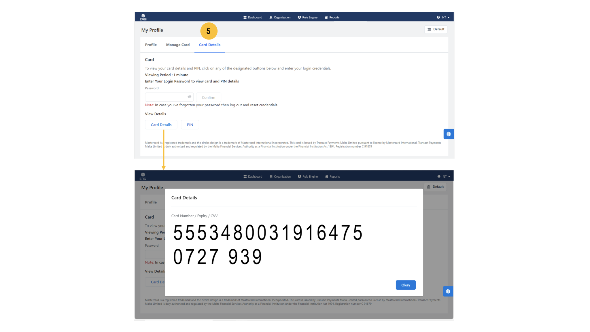 ii.Enter your password to confirm your identity. Once the correct password is entered, the “Card Details” and “PIN” buttons will be enabled for one minute.