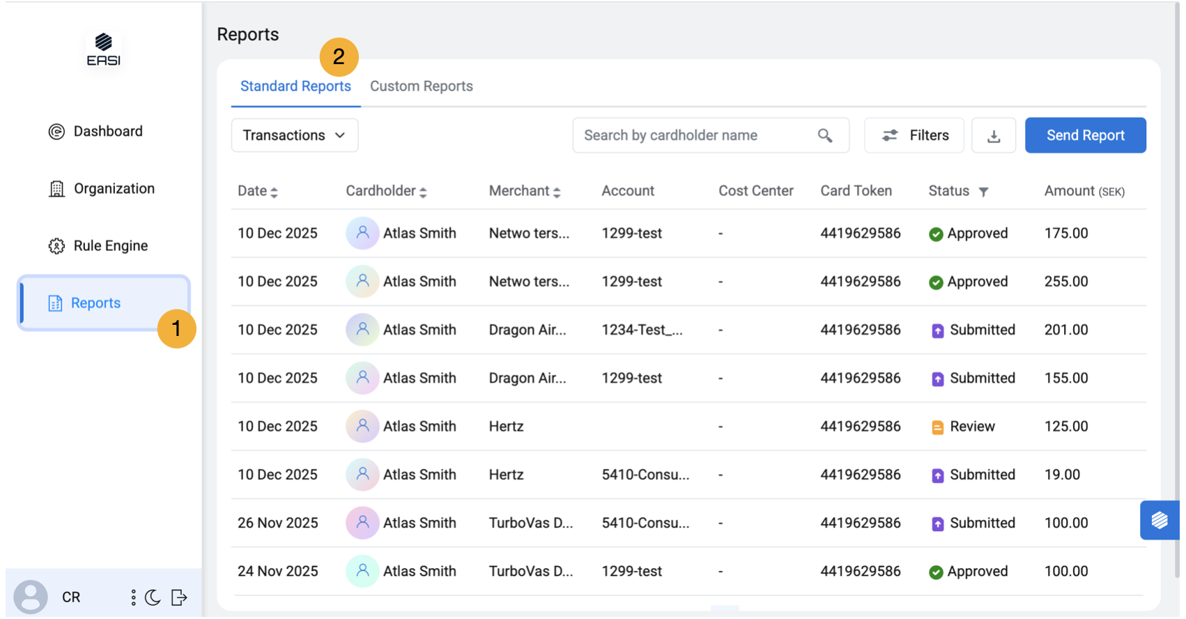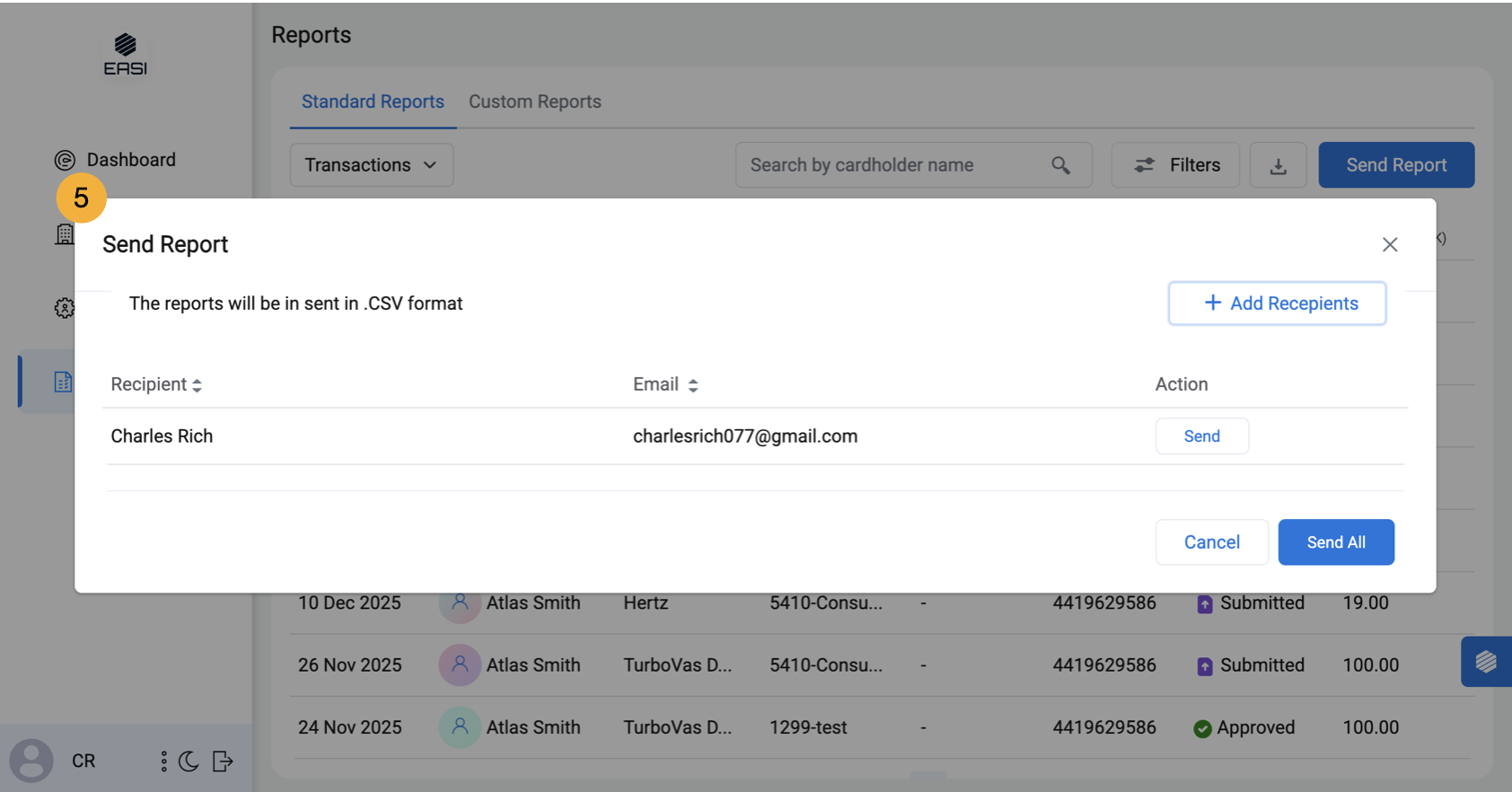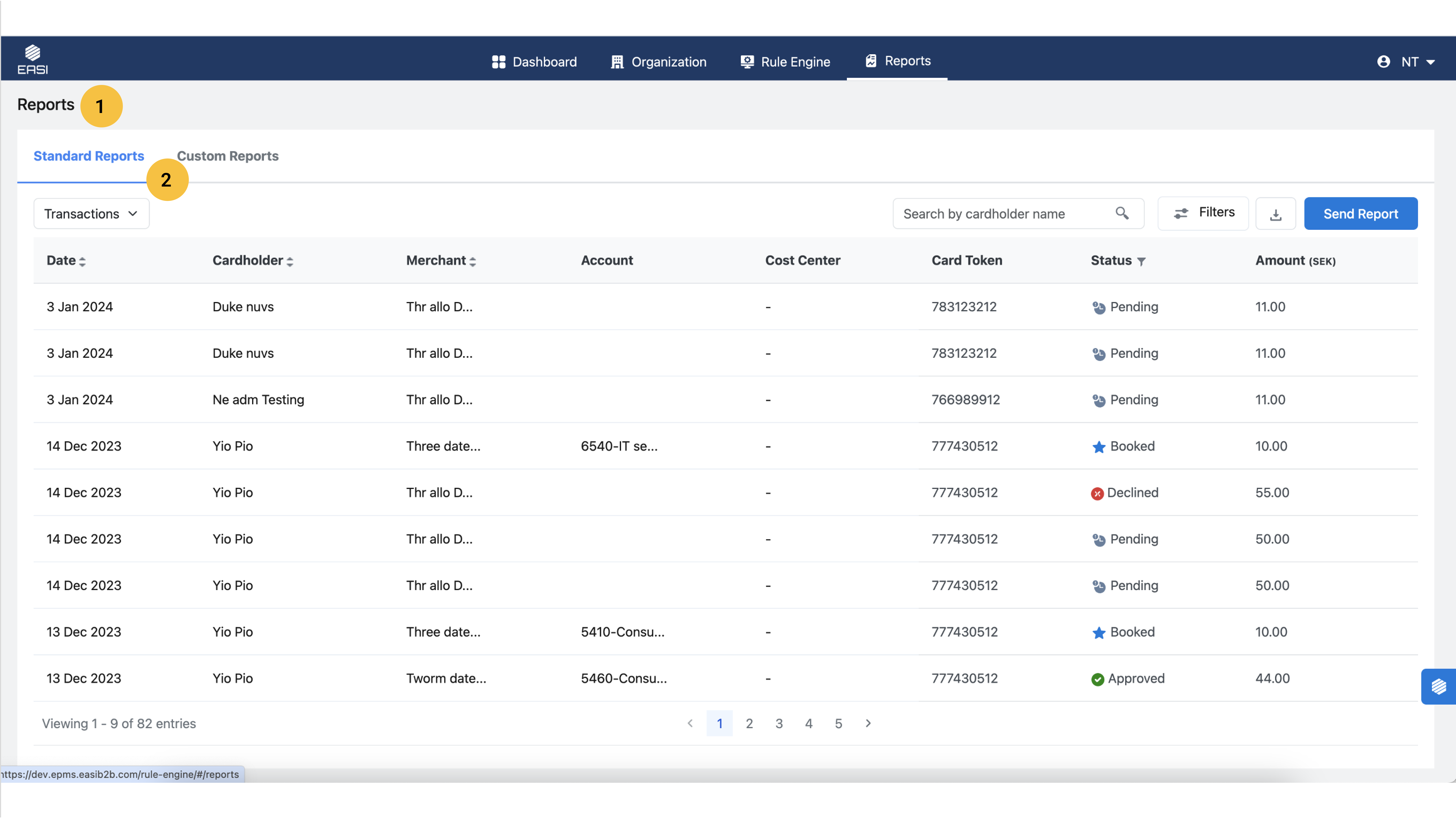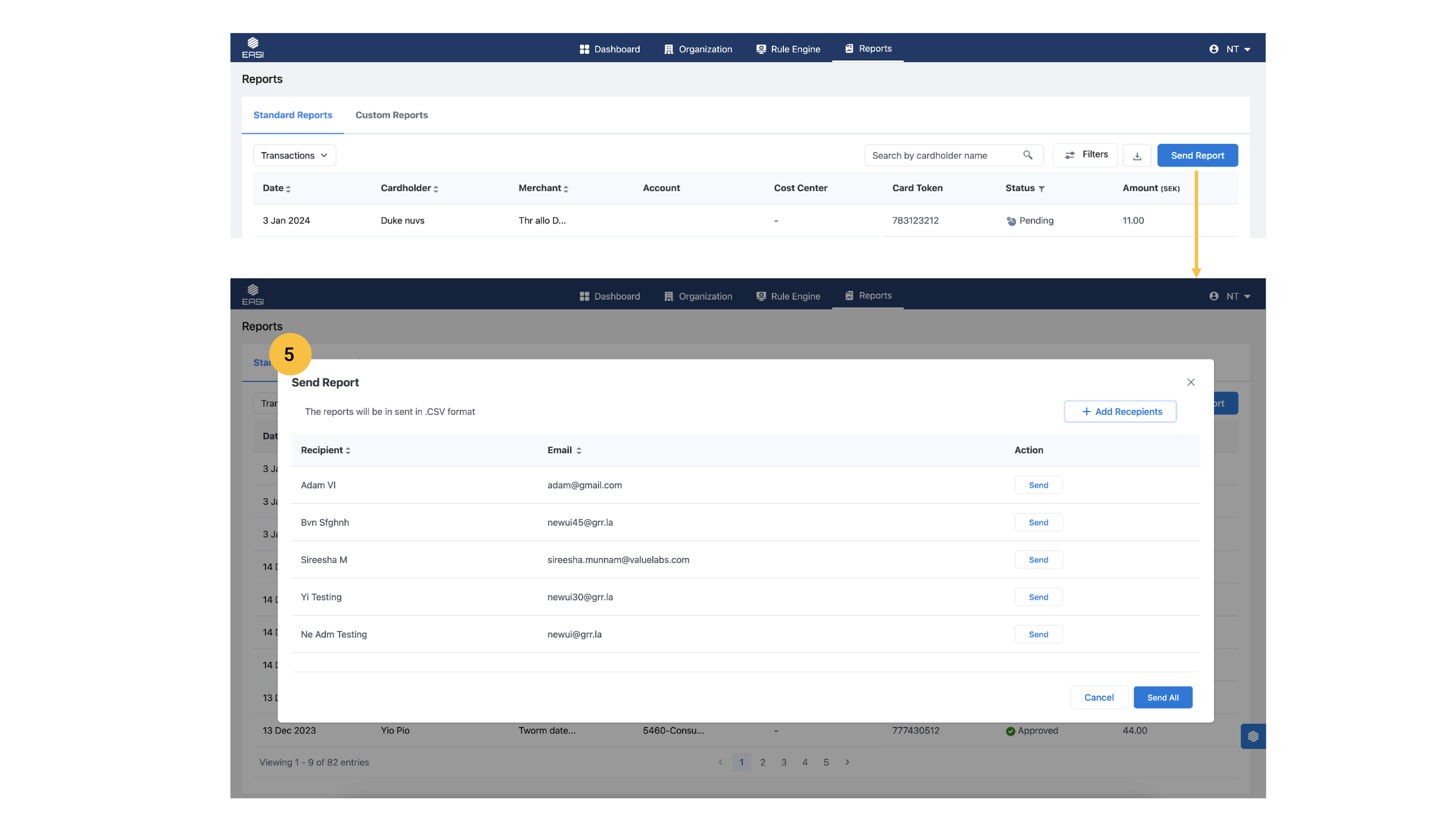 1. In Reports page, the transaction details can be viewed and sent to other admins or users within the organization as needed.