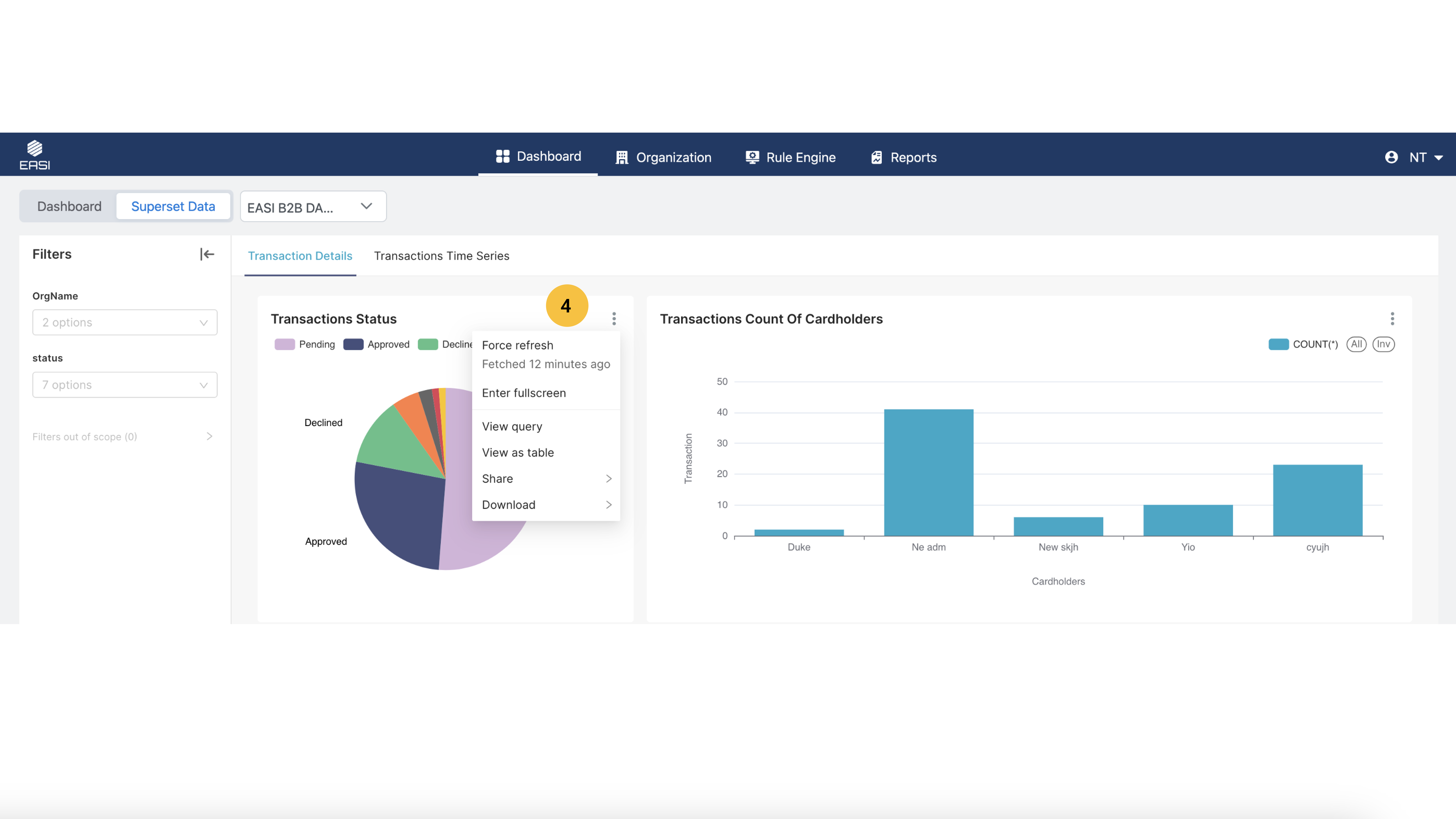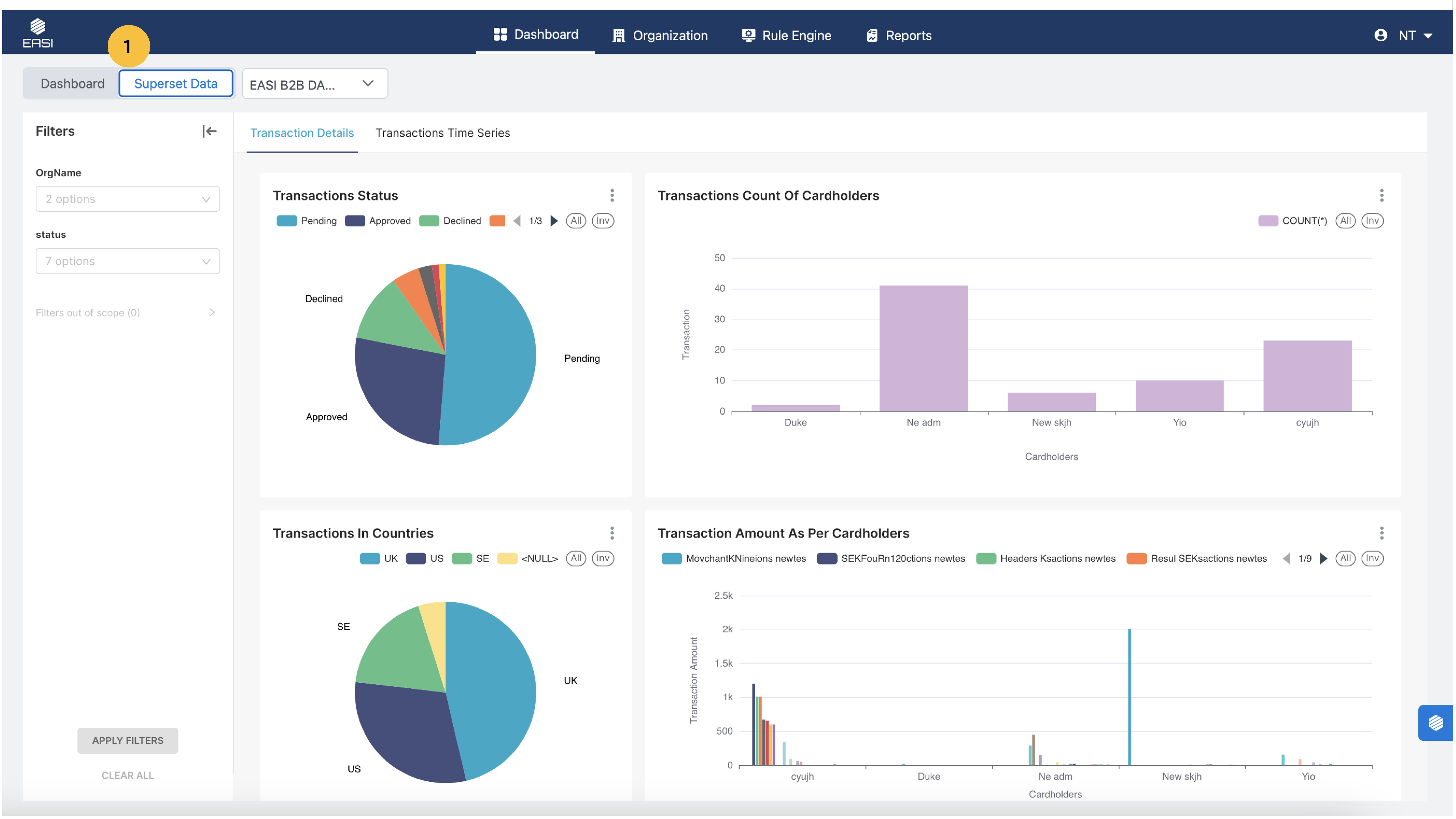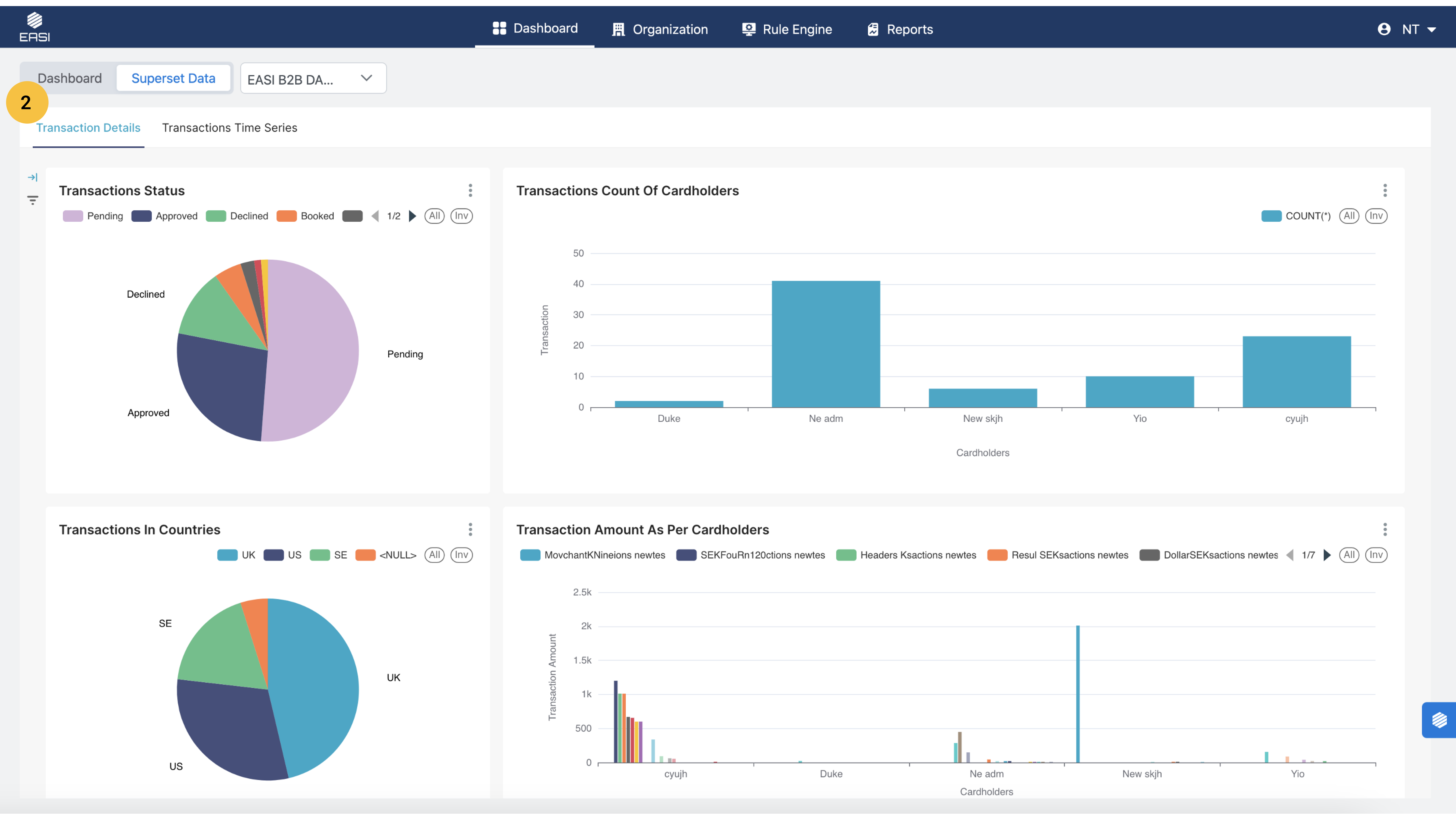 A variety of graphs displaying information related to transactions status categories, merchants, cardholders and their expense amounts.