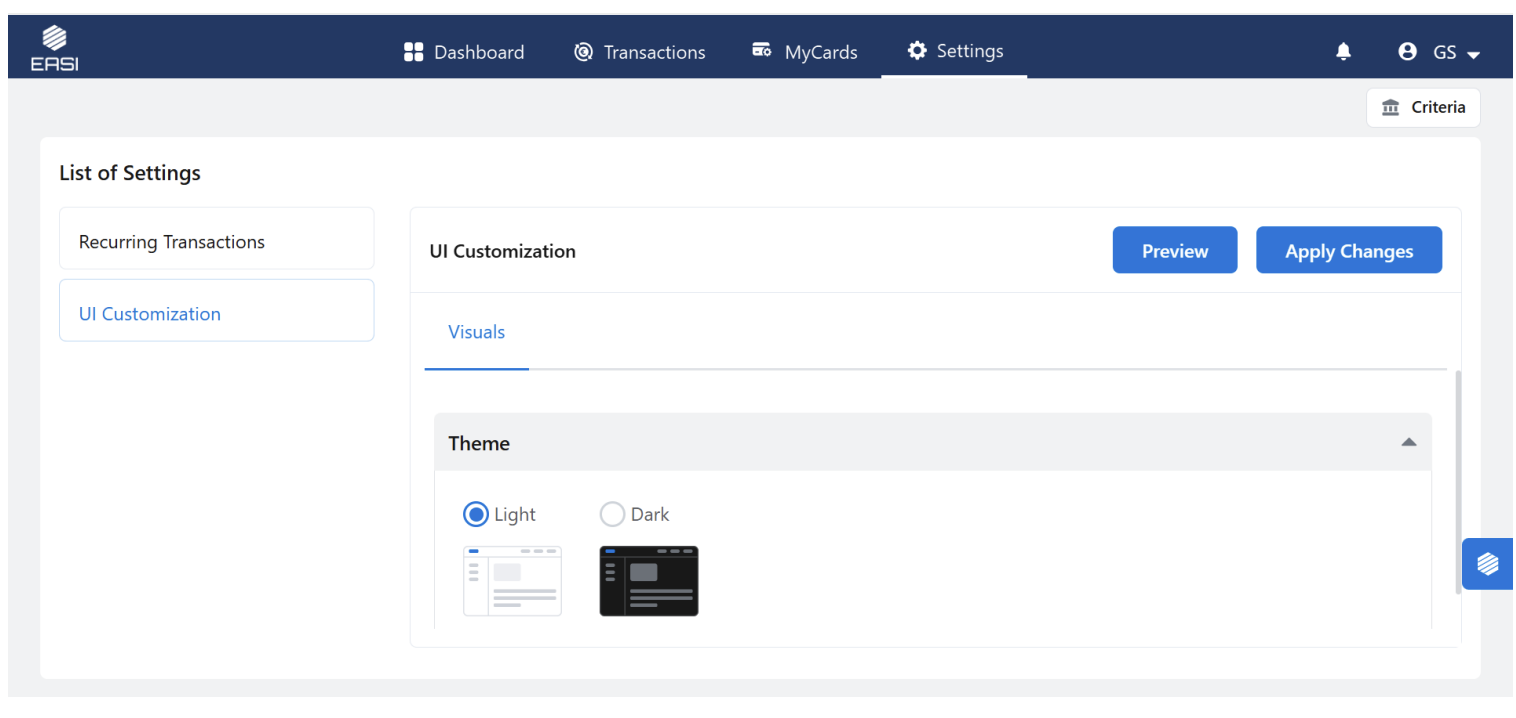 As a cardholder you will be able to access the Visual section and there only theme settings is available. 1.Navigate to the Settings Module. 2.Locate the settings tab in the main navigation tabs and click on it . 3.Only theme settings is available in visual Tab